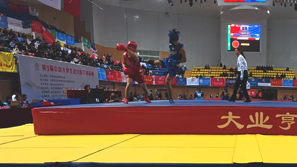 2025年11月1日-8日,由中国学生体育联合会主办的第9届中国大学生武术散打锦标赛在河北省迁安市唐山九江体育中心体育馆举行。我校散打队在领队刘贇、教练黄禹老师的带领下,经过八天的激烈角逐,邢政同学取得了男子乙A组62kg季军的优异成绩。